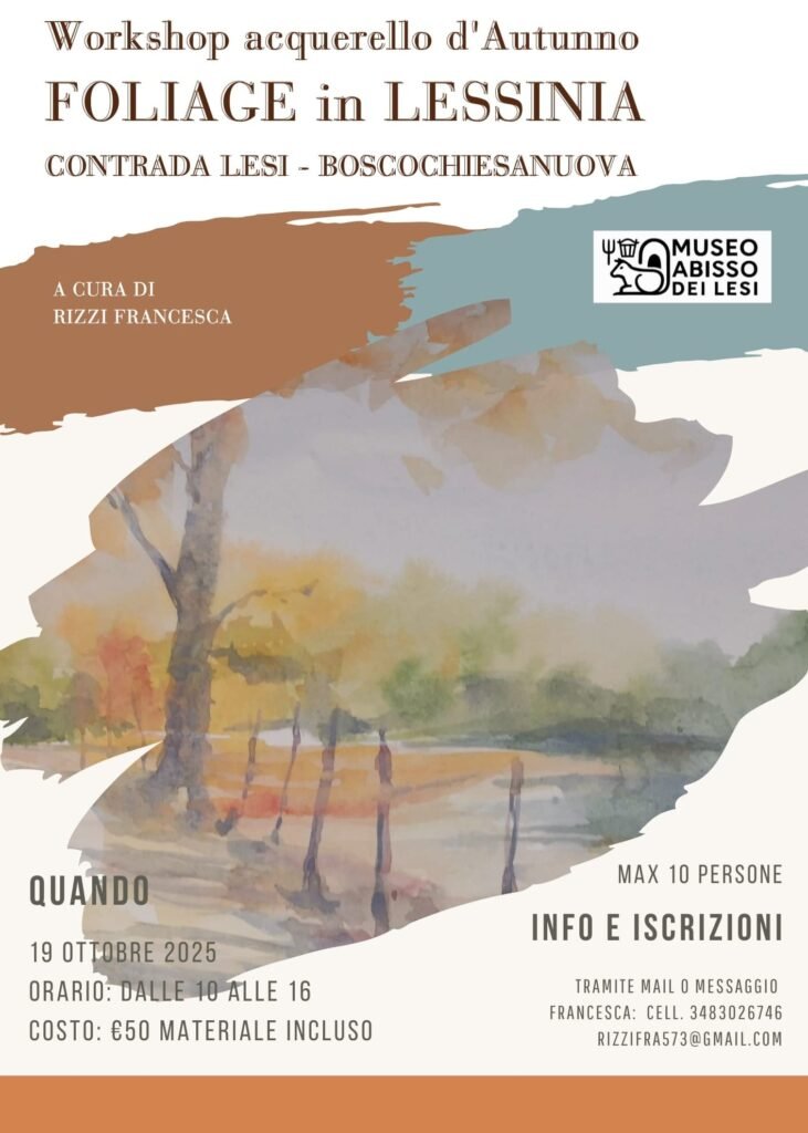 Il prossimo 19 ottobre 2025, tra le colline dorate della Lessinia, si terrà un appuntamento imperdibile per gli amanti della natura e dell’arte: il Workshop d’Acquerello d’Autunno – “Foliage in Lessinia”, a cura di Rizzi Francesca.L’incontro avrà luogo nella suggestiva Contrada Lesi, a Bosco Chiesanuova, e sarà ospitato dal Museo Abisso dei Lesi, cornice ideale per una giornata di creatività immersa nel paesaggio montano. Il workshop, della durata di sei ore (dalle 10 alle 16), guiderà i partecipanti alla scoperta delle tecniche base e avanzate dell’acquerello, con particolare attenzione alla resa dei colori e delle atmosfere autunnali: foglie dorate, riflessi di luce e sfumature che solo la Lessinia sa offrire in questa stagione. L’attività è aperta a un massimo di 10 partecipanti, per garantire un’esperienza formativa e personale di qualità.Il costo di partecipazione è di 50 euro, materiale incluso, rendendo il laboratorio accessibile anche a chi desidera avvicinarsi per la prima volta alla pittura ad acquerello. Per informazioni e iscrizioni è possibile contattare direttamente la curatrice:📞 Francesca – 348 3026746📧 rizzifra573@gmail.com Un’occasione unica per coniugare arte, natura e relax, respirando l’atmosfera autunnale della Lessinia e lasciandosi ispirare dai suoi paesaggi mozzafiato.
